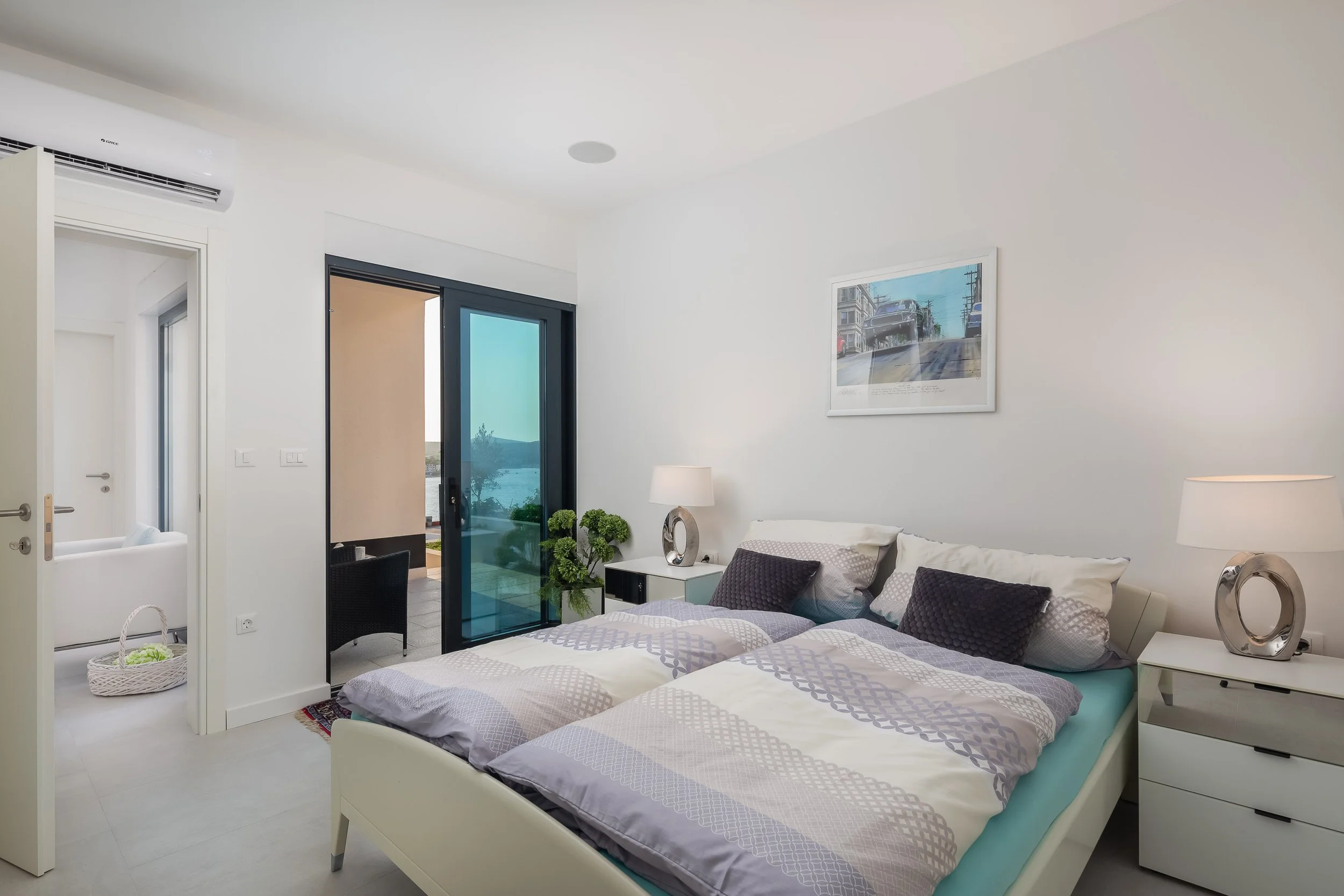 Insgesamt 3 Schlafzimmer mit 2 x Kingsize und einmal Queen Size Betten in einem modernen, hellen Stil, alle mit eigenen Bad. Zusätzlich gibt es noch ein Gästezimmer mit Schlafcouch. Jedes Zimmer verfügt über TV mit Internetanschluss und Netflix. Der großflächige Wohnraum ist mit hellen Ledermöbeln ausgestattet, 65 Zoll Fernseher.